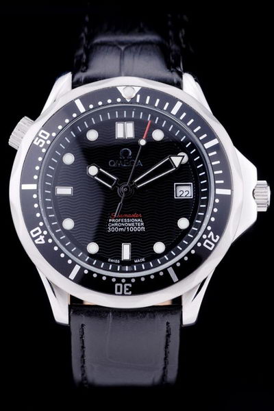 Bracelet: Omega heat embossed black crocodile leather strap with Omega inscribed polished stainless steel hook clasp